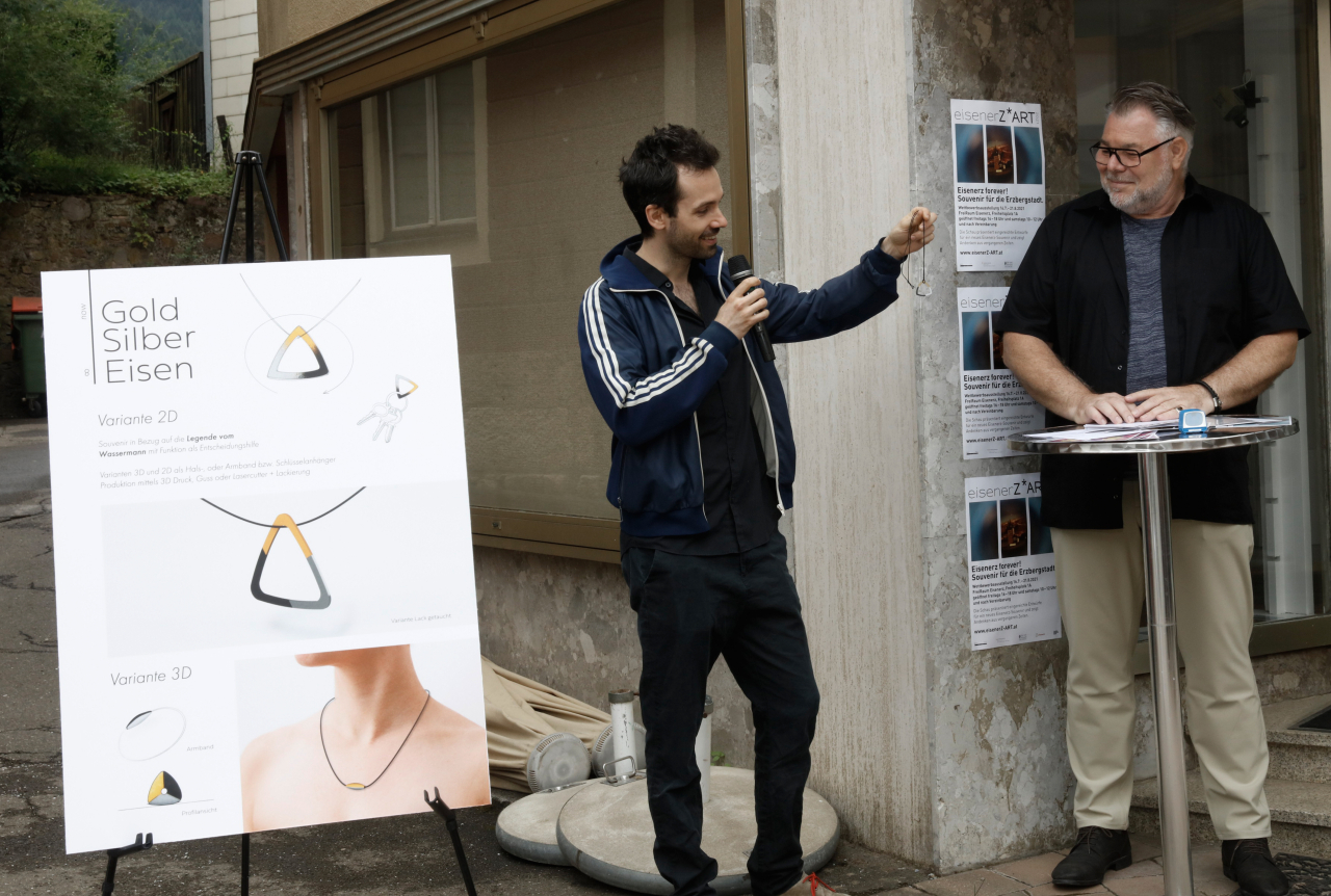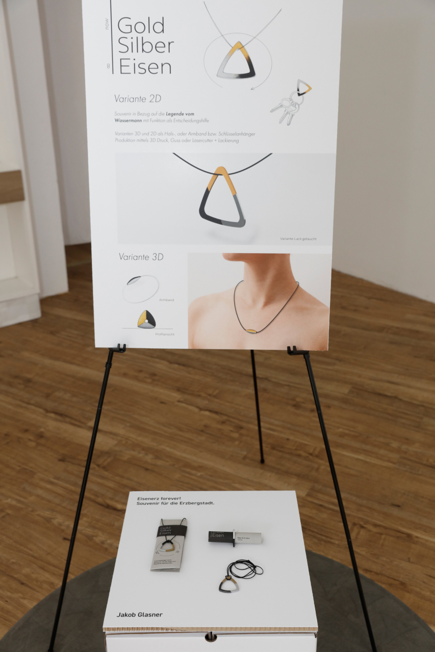 Von den 7 für die zweite Wettbewerbsstufe nominierten Beiträgen wurde schließlich einstimmig der Grazer Konzeptkünstler und Designer Jakob Glasner zum Sieger gekürt: Sein ebenso ästhetischer wie spielerischer und zudem perfekt präsentierter Entwurf „Gold Silber Eisen“, ein auf der Legende des Wassermanns basierendes Schmuckstück, Accessoire und Entscheidungshilfe-Tool, hatte die 7-köpfige Jury verzaubert.