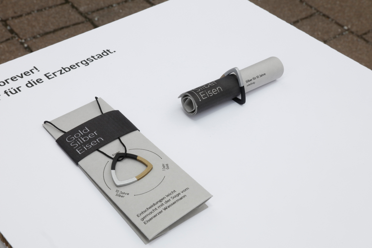 „Gold Silber Eisen“ ist ein um den Hals zu tragendes Schmuckstück wie auch ein Anhänger etwa für den Rucksack oder den Schlüsselbund. Das Objekt ist inspiriert von der Legende des Wassermanns, der den Eisenerzern als Lohn für seine Freiheit einen von drei Wünschen — Gold für kurze Zeit, Silber für eine etwas längere Zeit oder Eisen für immerdar — zur Wahl stellte.